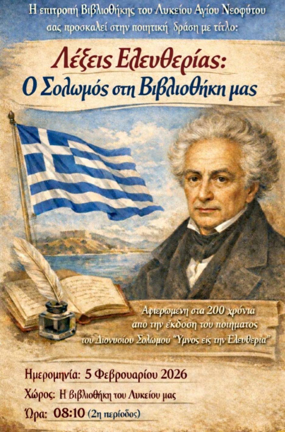 Η Επιτροπή Βιβλιοθήκης διοργάνωσε ποιητική δράση με τίτλο: «Λέξεις Ελευθερίας: Ο Σολωμός στη Βιβλιοθήκη μας». Με αφορμή τη συμπλήρωση 200 χρόνων από την έκδοση του Ύμνου εις την Ελευθερίαν και στο πλαίσιο του Διαγωνισμού της Ιεράς Μητροπόλεως Πάφου, η Επιτροπή Βιβλιοθήκης διοργάνωσε ποιητική δράση με θέμα τον Διονύσιο Σολωμό και τον Ύμνο εις την Ελευθερίαν. Οι μαθητές που παρακολούθησαν τη δράση είχαν την ευκαιρία να ακούσουν συμμαθητές και συμμαθήτριές τους να απαγγέλλουν στροφές από τον ύμνο και αποσπάσματα από διάφορα βιβλία του Εθνικού μας ποιητή. Η πινακίδα που ετοιμάστηκε στη Βιβλιοθήκη εμπλουτίστηκε με λέξεις Ελευθερίας: Ισότητα, Δικαιοσύνη, Αντίσταση, Ευθύνη, Συνείδηση, Συλλογικότητα, Ανθρώπινα Δικαιώματα. Παράλληλα, οι μαθητές είχαν την ευκαιρία να μελετήσουν και να ξεφυλλίσουν βιβλία του Διονύσιου Σολωμού, εμβαθύνοντας στο έργο και τη σκέψη του. Μέσα από τη δράση αναδείχτηκαν η σημασία της καθιέρωσης από το 1966 του Ύμνου εις την Ελευθερίαν, ως Εθνικού Ύμνου της Κύπρου καθώς και οι κοινές αξίες που διέπουν την Ελλάδα και την Κύπρο. Η συγκεκριμένη πρωτοβουλία αποσκοπούσε στην εξοικείωση των μαθητών με τις διαχρονικές αξίες και τα μηνύματα του ποιήματος, συμβάλλοντας στην καλλιέργεια και ενίσχυση της εθνικής τους συνείδησης.