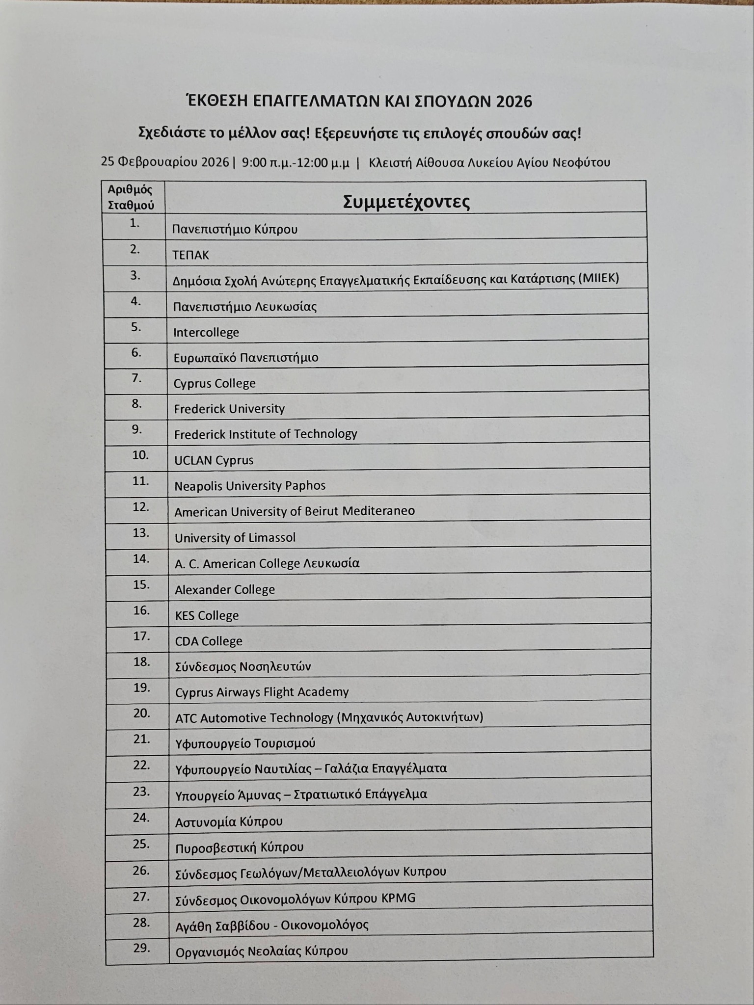 25 Φεβρουαρίου 2026 9:00π.μ. - 12:00 μ.μ. Κλειστεί Αίθουσα Λυκείου Αγίου Νεοφύτου